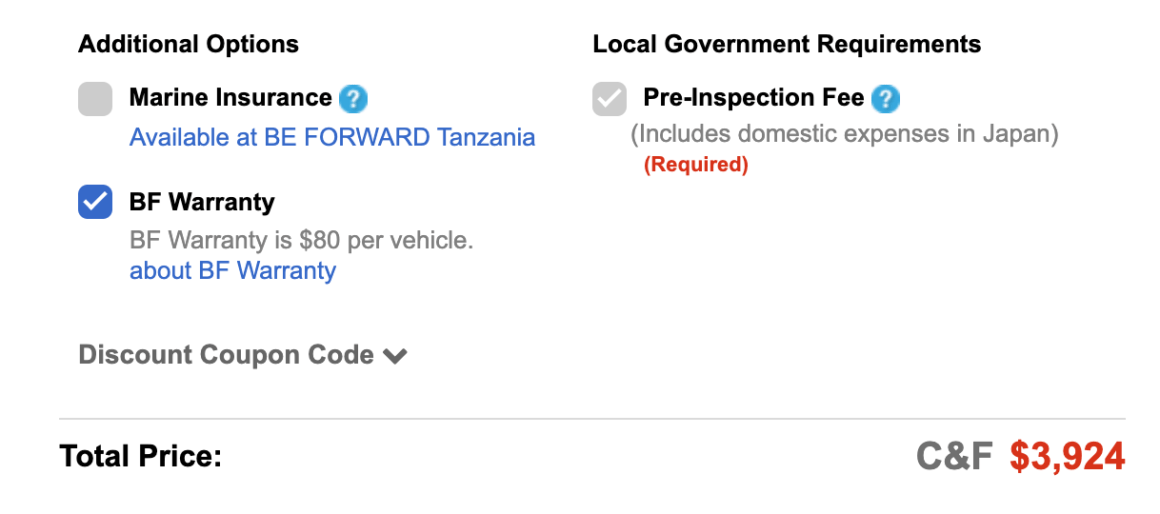 To calculate the total price, add the total from Step 1 (vehicle price), Step 3 (total taxes) and port costs (will depend on the vehicle).