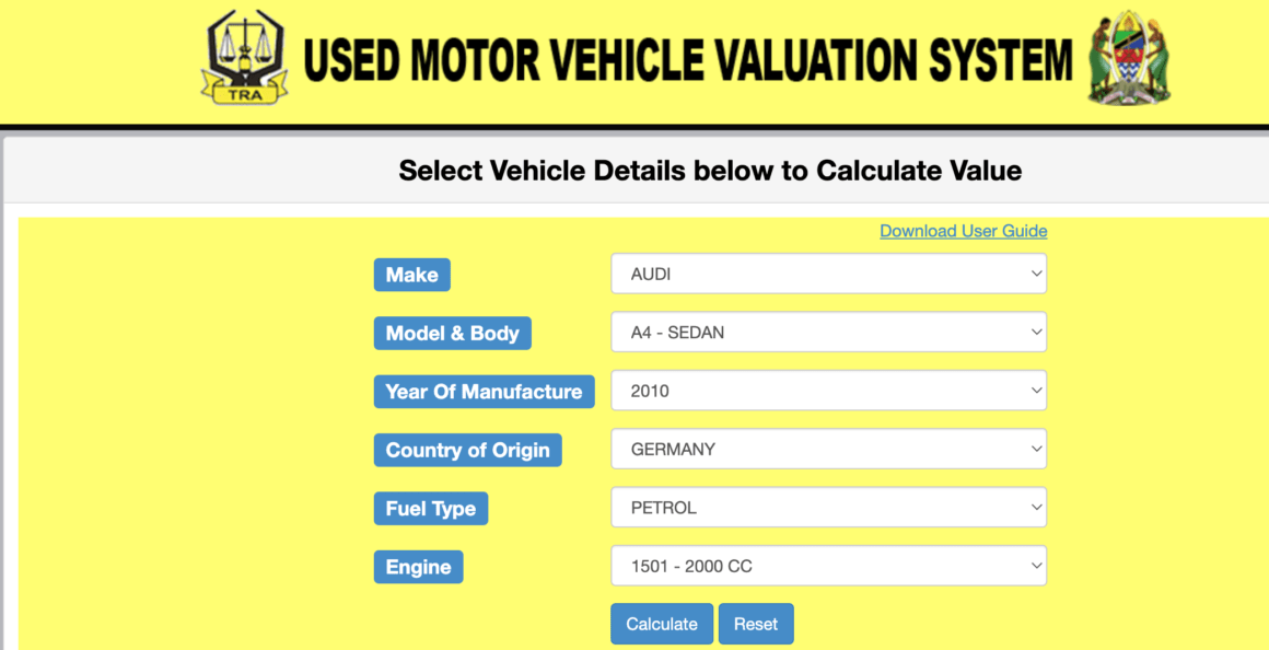 Visit the TRA website (https://www.tra.go.tz/) and click on calculator and tools> Calculator & Tool for Motor Vehicle. You can also access the tool directly by clicking this link Used Motor Vehicle Valuation System (tra.go.tz).