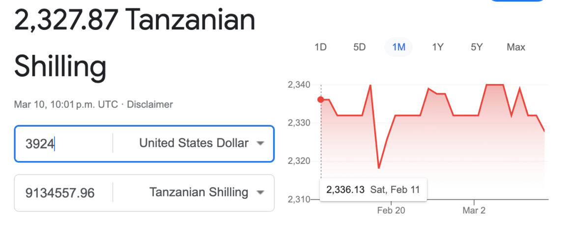 Convert this total to TZS (Tanzanian shillings) using any currency converter. You can use Google or this website 1 USD to TZS – US Dollars to Tanzanian Shillings Exchange Rate (xe.com).