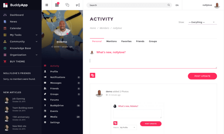 BuddyApp is one of the best-looking WordPress themes. The theme is mobile optimized for both mobile and desktop. The theme also has live notifications, live chats, media share gallery, groups, forums, and an intuitive UI. This theme is also great to use within organizations as it allows you to create an intranet and extranet connection.